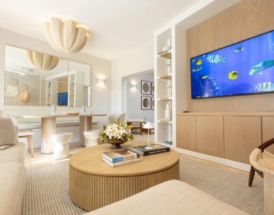 La villa s’organise autour d’espaces de vie à double hauteur qui favorisent la circulation fluide entre intérieur et extérieur. Les salons, les terrasses et la salle à manger communiquent naturellement avec l’océan. Un conseil apprécié consiste à programmer votre première soirée au coucher du soleil, lorsque les reflets turquoise subliment la piscine à débordement.