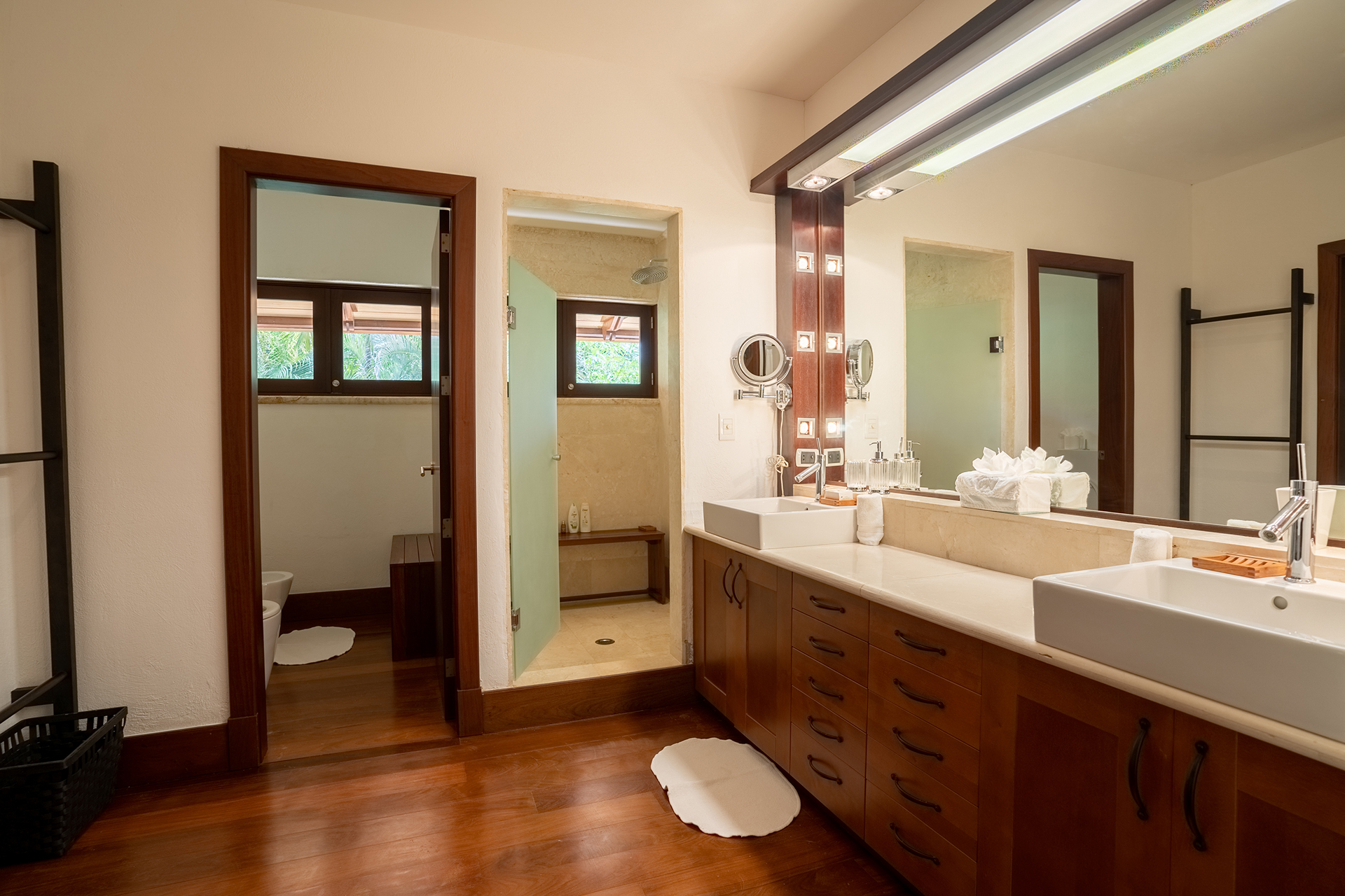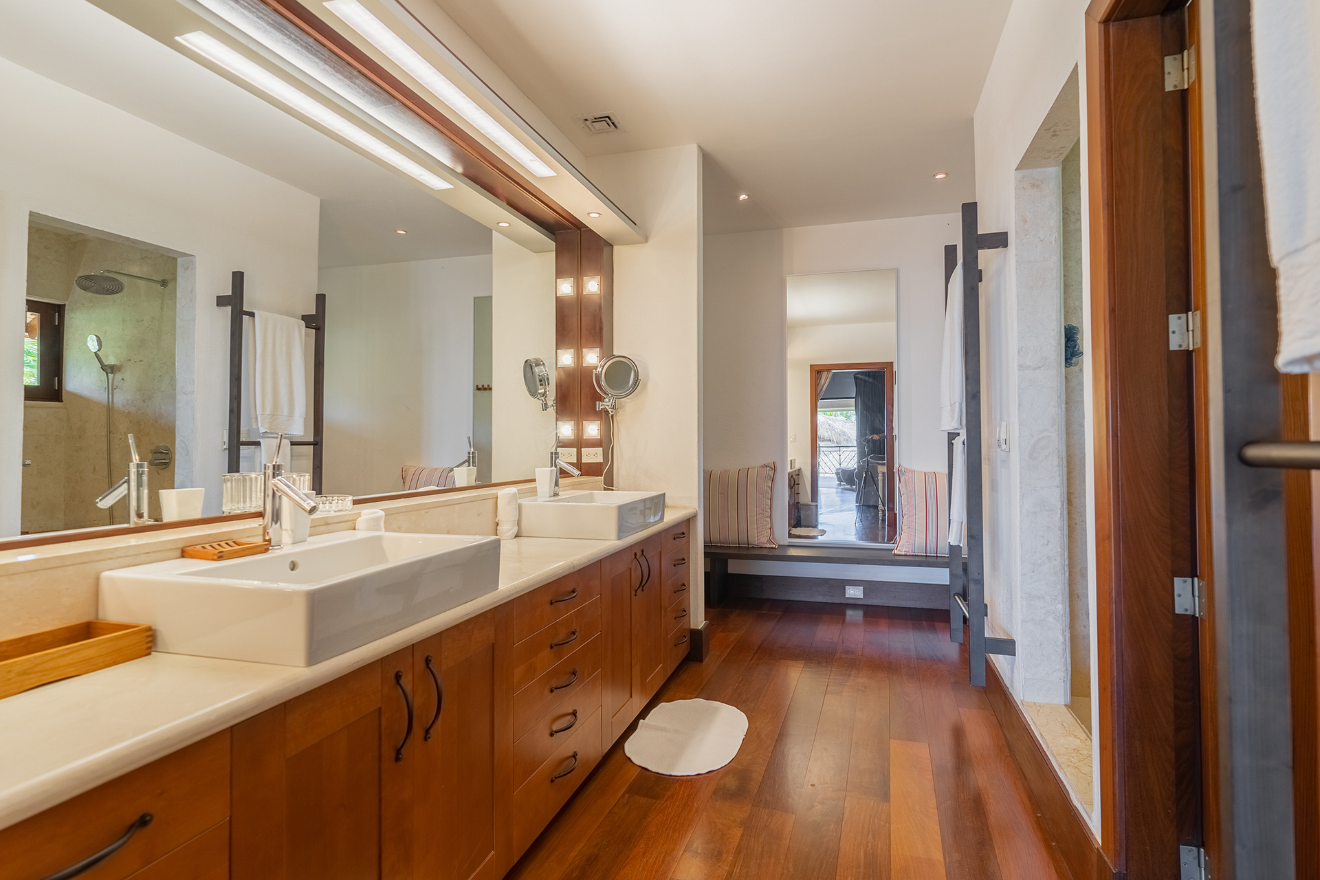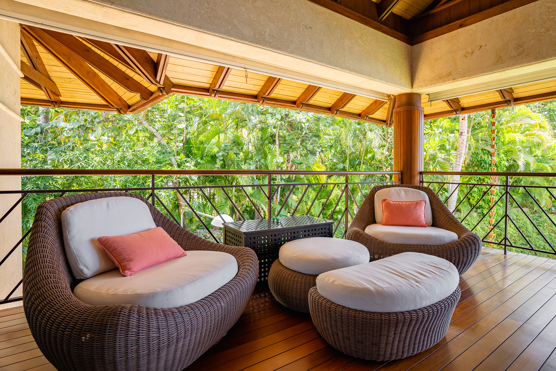 La location Casa Bahia Azul Casa de Campo propose cinq chambres spacieuses, toutes orientées vers l’océan ou les jardins tropicaux. Les plafonds cathédrale renforcent la sensation d’espace et de fraîcheur. La suite principale se distingue par sa terrasse privée face à la mer, idéale pour un café au lever du soleil.