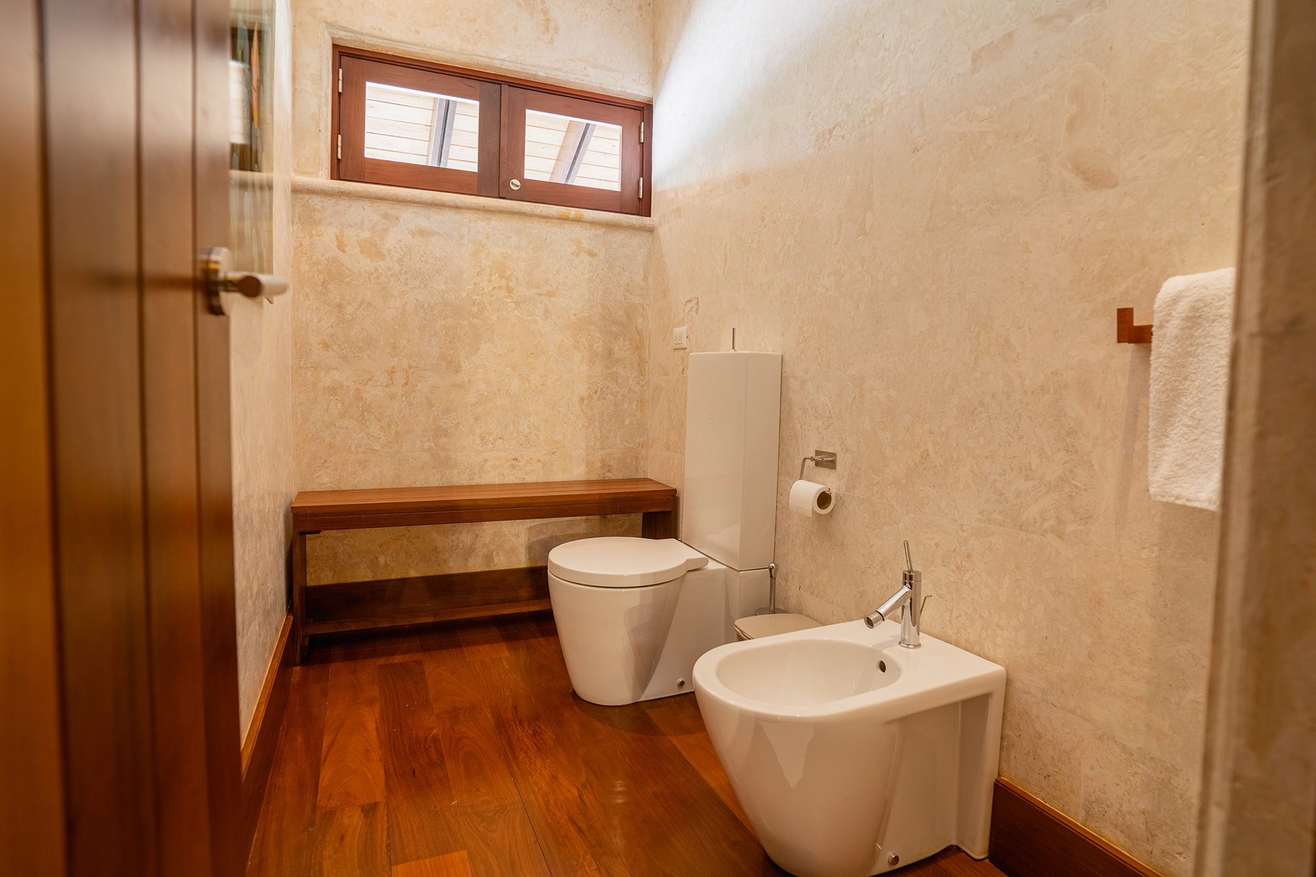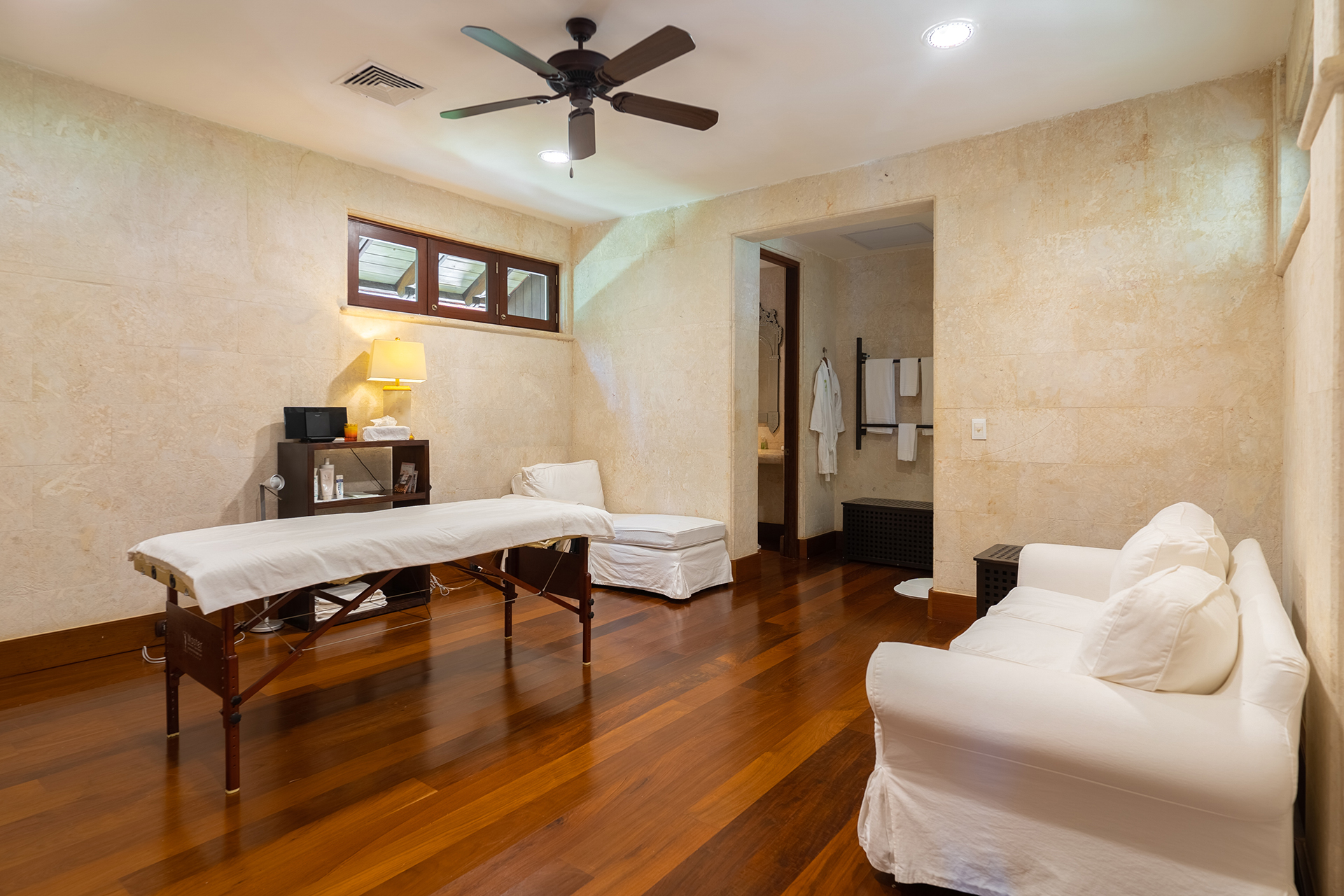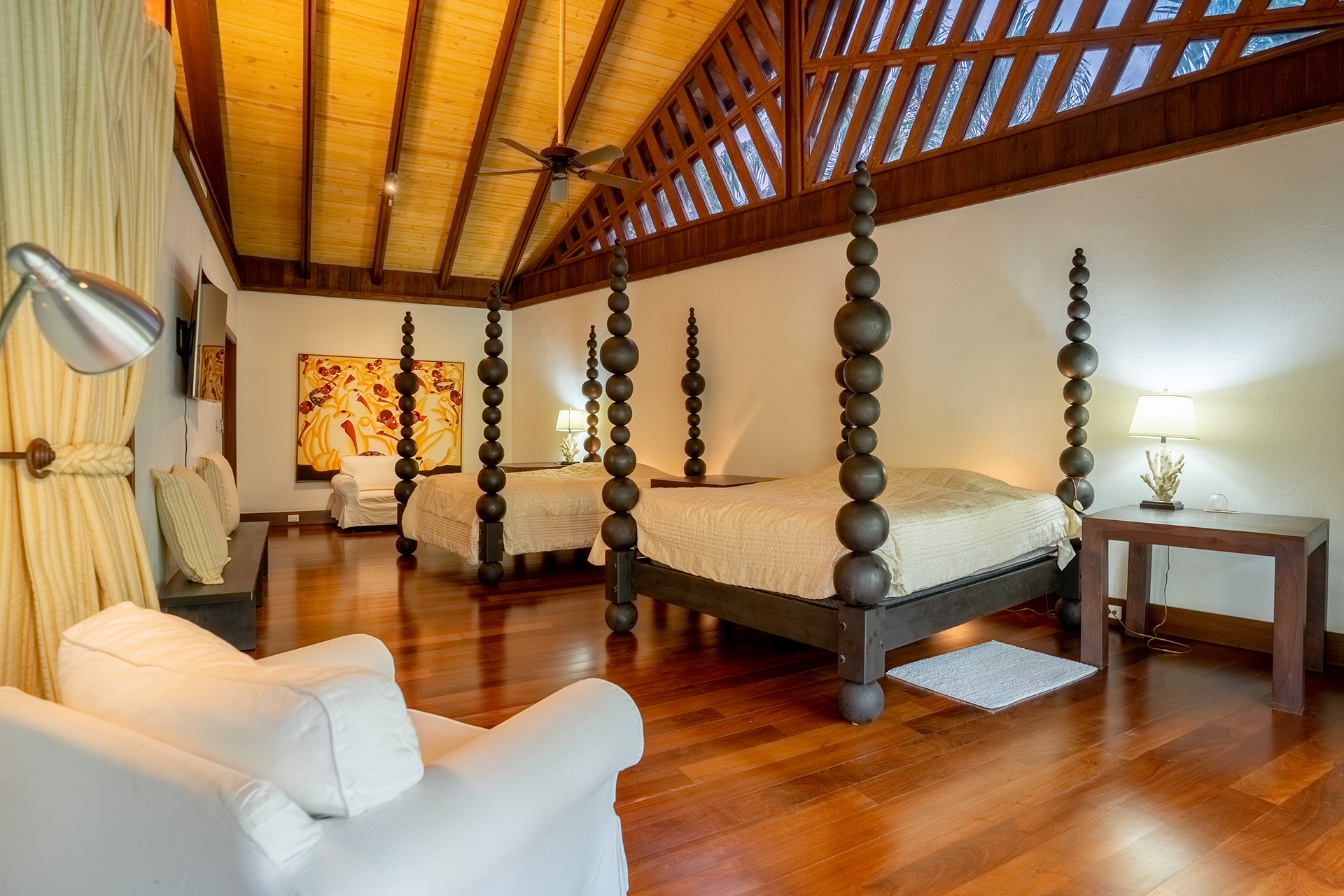 La location Casa Bahia Azul Casa de Campo propose cinq chambres spacieuses, toutes orientées vers l’océan ou les jardins tropicaux. Les plafonds cathédrale renforcent la sensation d’espace et de fraîcheur. La suite principale se distingue par sa terrasse privée face à la mer, idéale pour un café au lever du soleil.