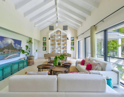 Les intérieurs de la villa Tortuga séduisent par leur atmosphère fraîche et contemporaine. Le salon principal s’ouvre sur le jardin et la piscine, favorisant une vie dedans dehors très agréable. Les œuvres modernes et les assises confortables créent un cadre convivial. Deux salons TV complètent l’espace, parfaits pour se retrouver en toute tranquillité.