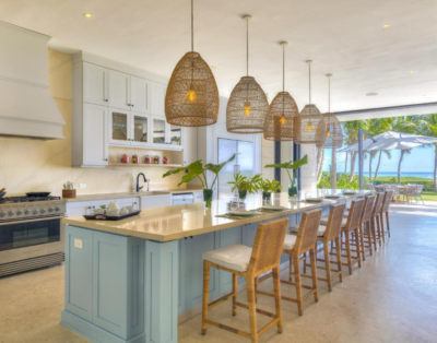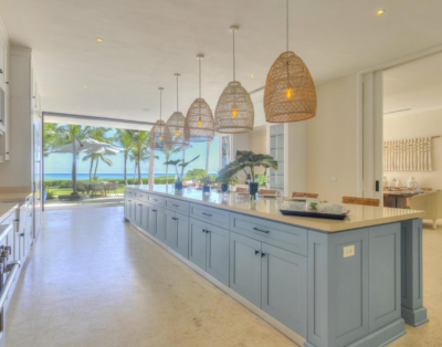 La cuisine, élégante et fonctionnelle, s’accompagne d’une salle à manger raffinée. À l’extérieur, la cuisine d’été et le barbecue invitent à des repas en plein air, sous le ciel caribéen.