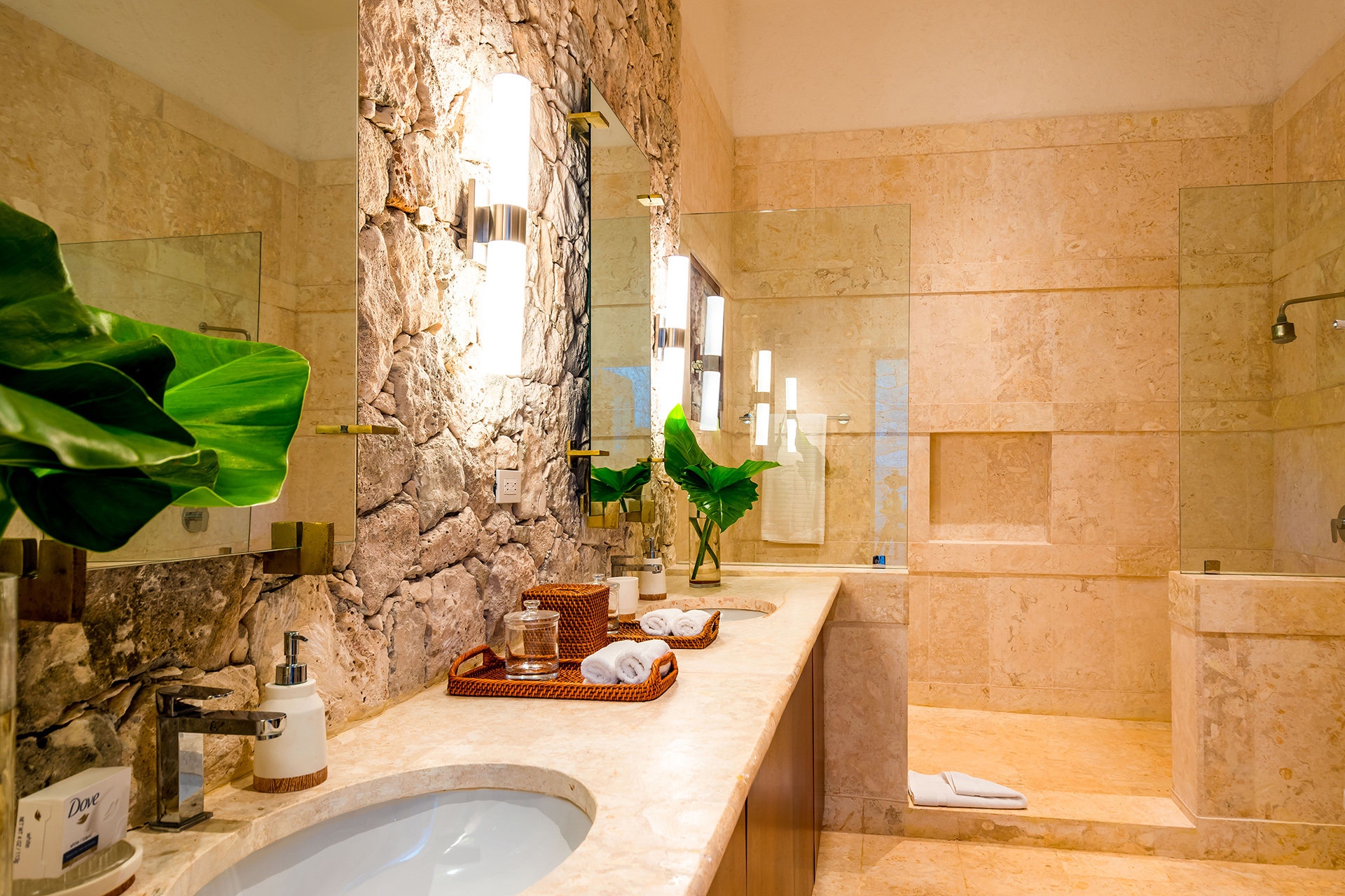 Les espaces intérieurs privilégient la fluidité et la lumière naturelle. Les salons s’ouvrent largement sur les terrasses et les jardins tropicaux. La décoration associe élégance contemporaine et matières naturelles sans surcharge visuelle. Chaque espace favorise une atmosphère apaisante et fonctionnelle. Les 8 chambres sont pour accueillir 16 personnes.