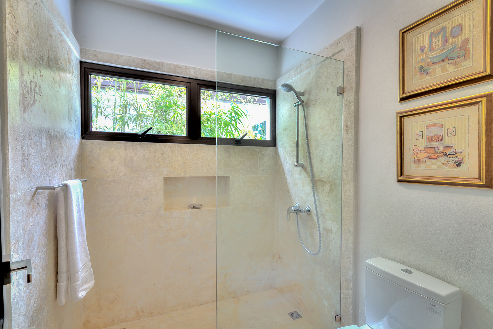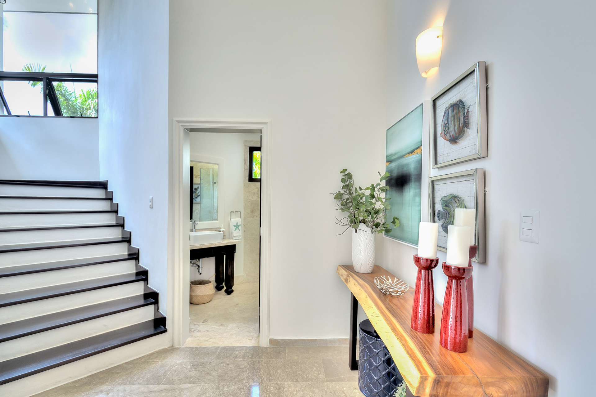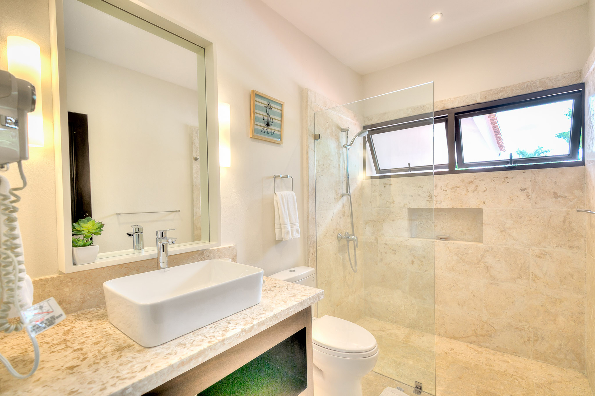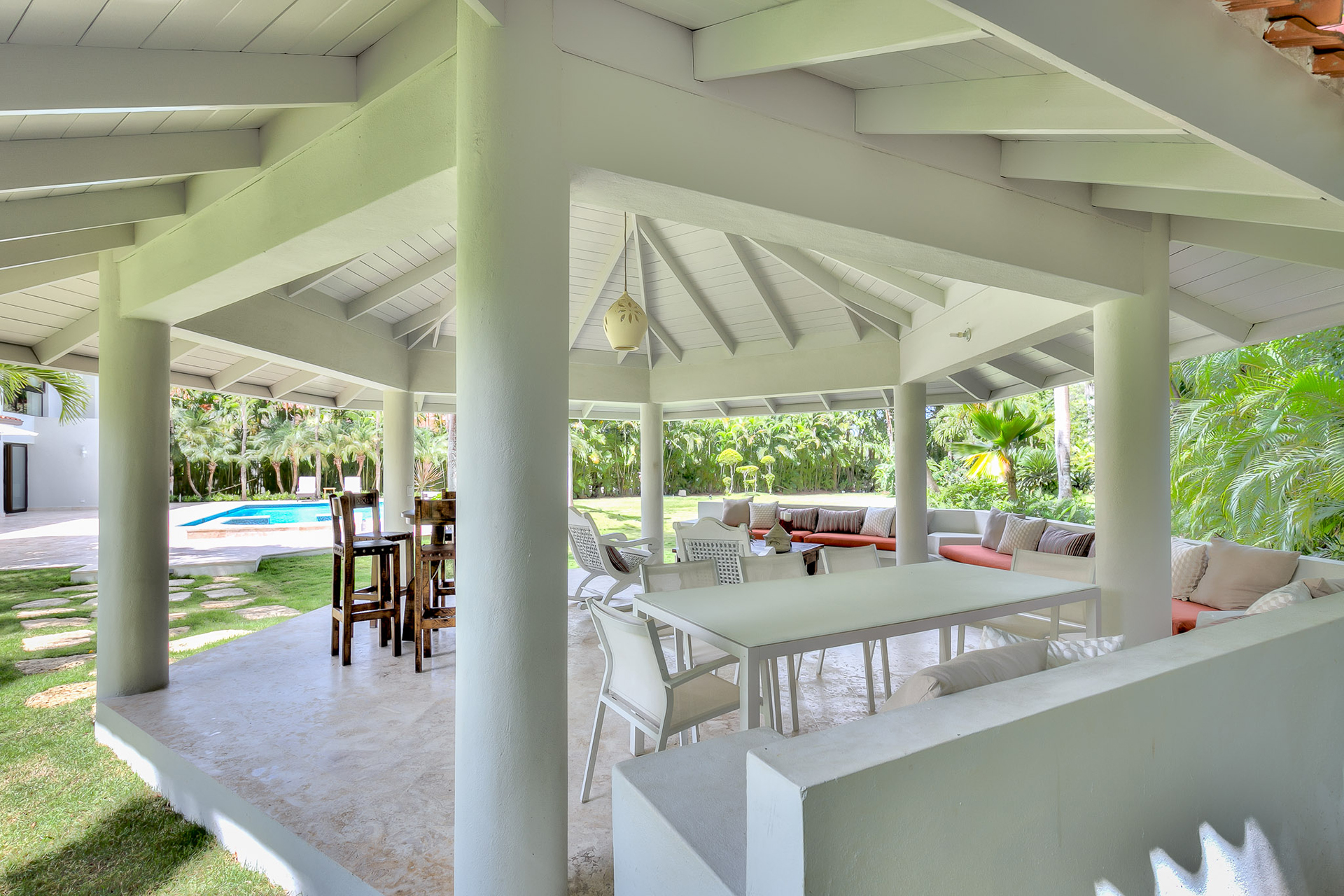 La terrasse en pierre poli entoure la piscine et le jacuzzi, offrant un cadre idéal pour profiter du soleil et de la chaleur caribéenne. Le palapa est un espace ombragé parfait pour savourer un cocktail, déjeuner en plein air ou se détendre sous les étoiles. Le jardin luxuriant complète l’expérience en créant un environnement calme et intime. Ainsi, les invités peuvent se relaxer après une journée sur la plage ou sur les parcours de golf environnants.