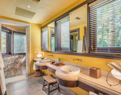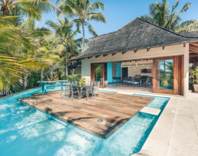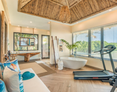 À l’extérieur, la piscine à débordement domine un paysage tropical apaisant. On y trouve aussi un gazebo, une douche extérieure et un espace spa. Le sauna privé apporte une dimension bien-être qui transforme chaque journée en parenthèse luxueuse. Ainsi, la villa devient un véritable sanctuaire, protégé et intime.