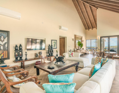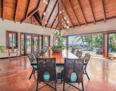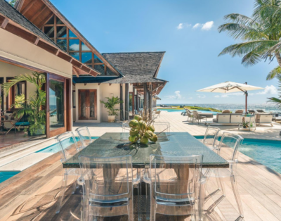 À l’intérieur, les espaces de vie sont lumineux et parfaitement agencés. Les larges baies vitrées ouvrent chaque pièce sur le jardin tropical, ce qui renforce la sensation d’espace. Le mobilier sur mesure, les textures naturelles et les œuvres d’art ajoutent une touche sophistiquée. De plus, les ambiances chaleureuses invitent à profiter autant des salons que des terrasses extérieures.