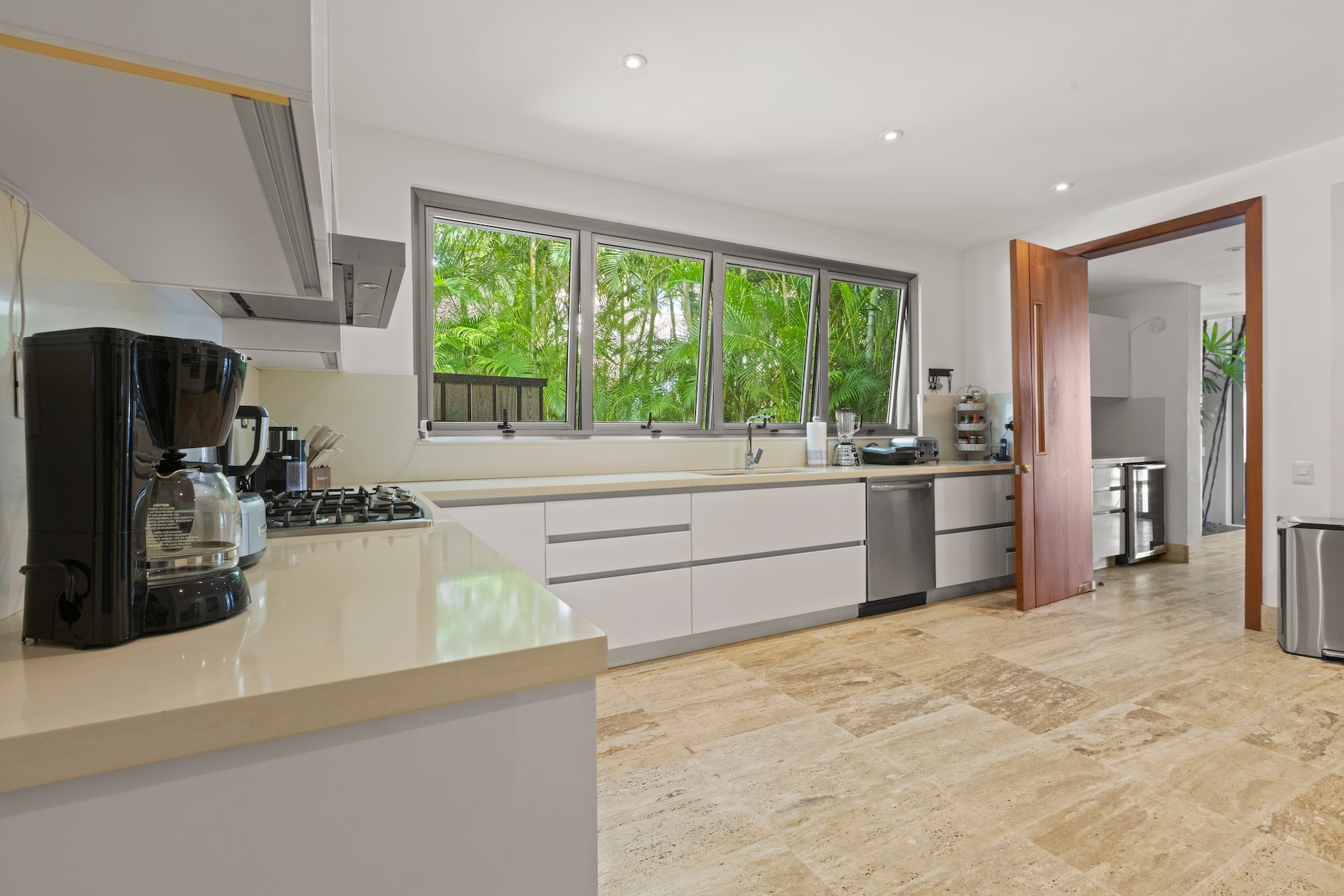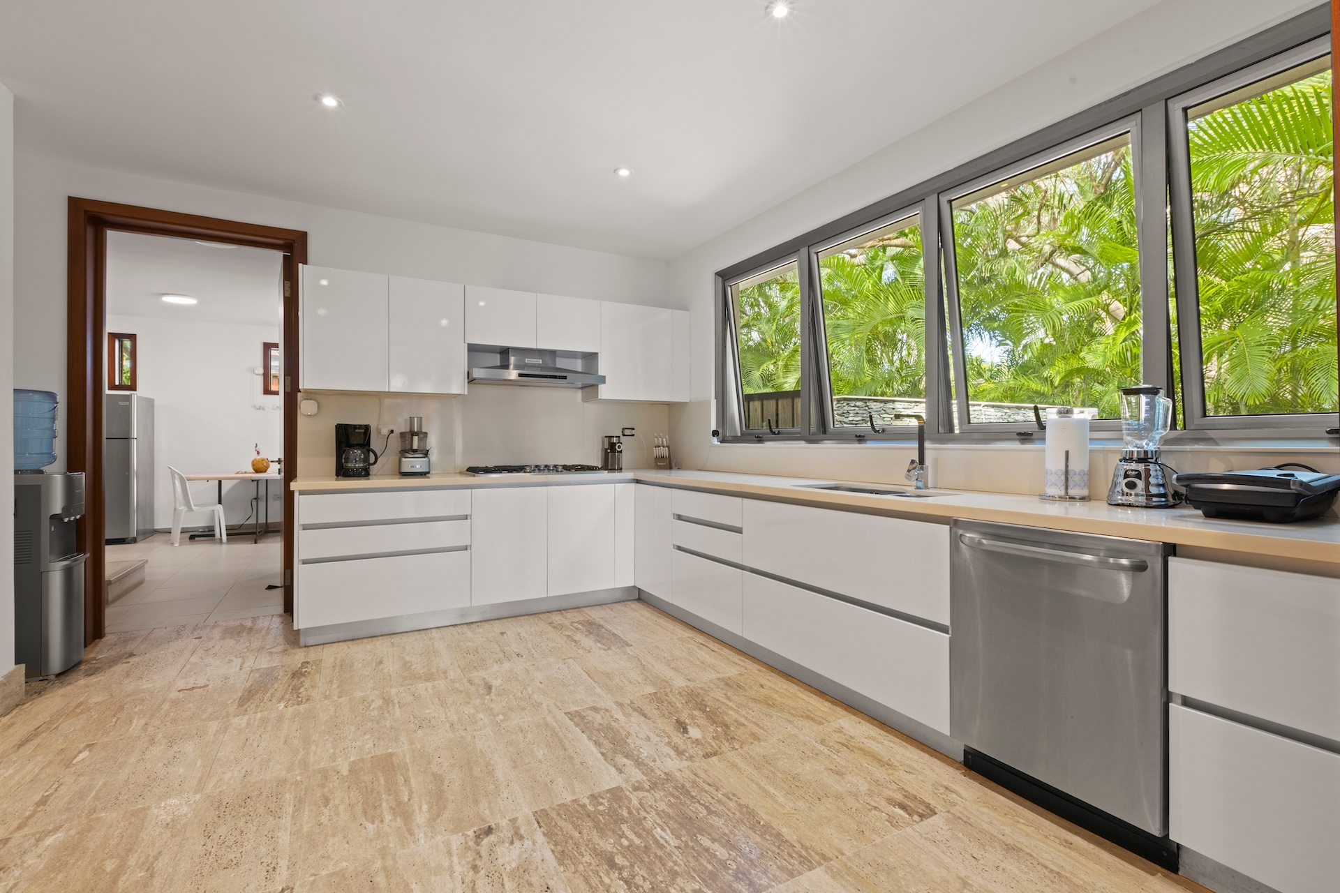 La cuisine moderne, entièrement équipée, s’intègre parfaitement à l’espace de vie. Elle permet de préparer des repas conviviaux ou d’accueillir un chef privé lors de votre location de villa de luxe. À proximité, la salle à manger offre un cadre idéal pour partager des moments privilégiés autour d’un dîner tropical.