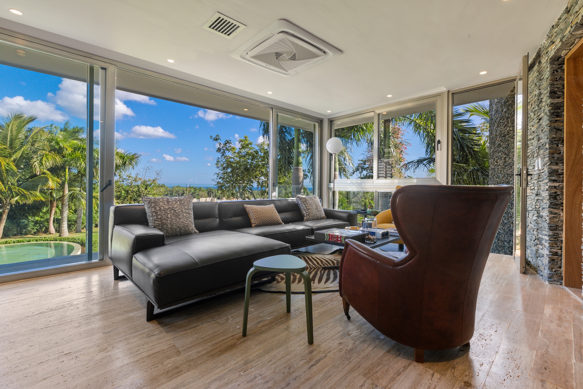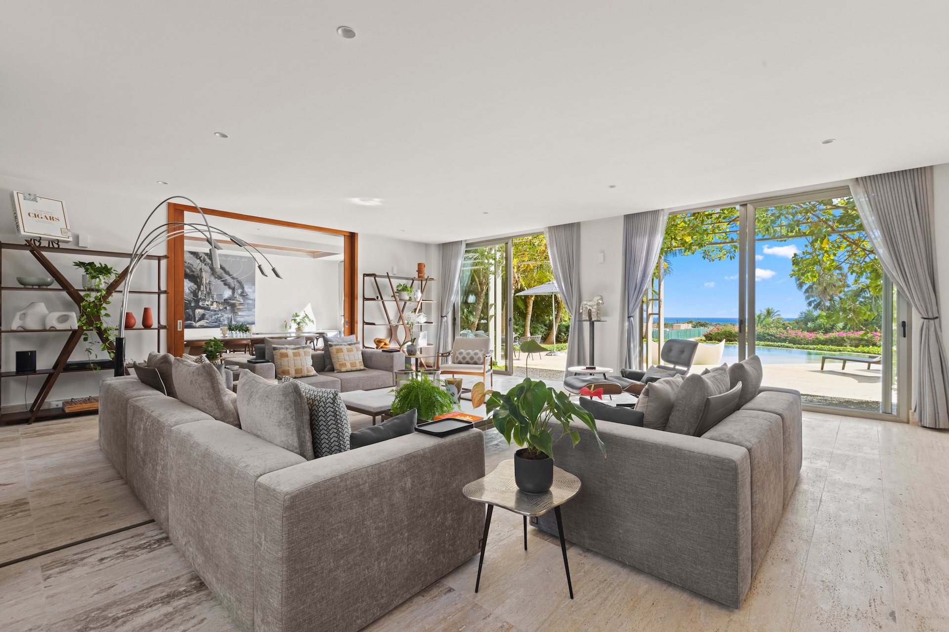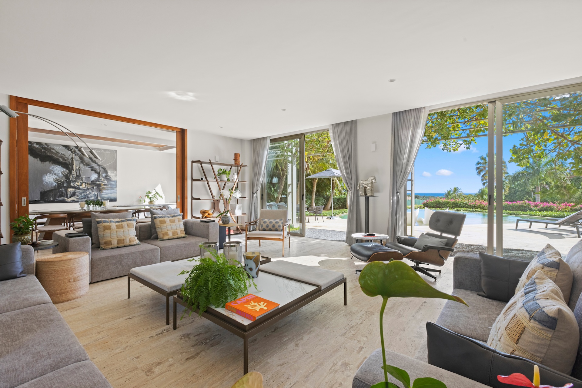 Les espaces intérieurs de Villa Agua ont été conçus pour offrir un équilibre parfait entre sophistication et convivialité. Dès le salon principal, de larges baies vitrées coulissantes ouvrent la pièce vers la terrasse et la piscine. Ainsi, la lumière naturelle circule librement et crée une sensation permanente d’espace et de bien-être.