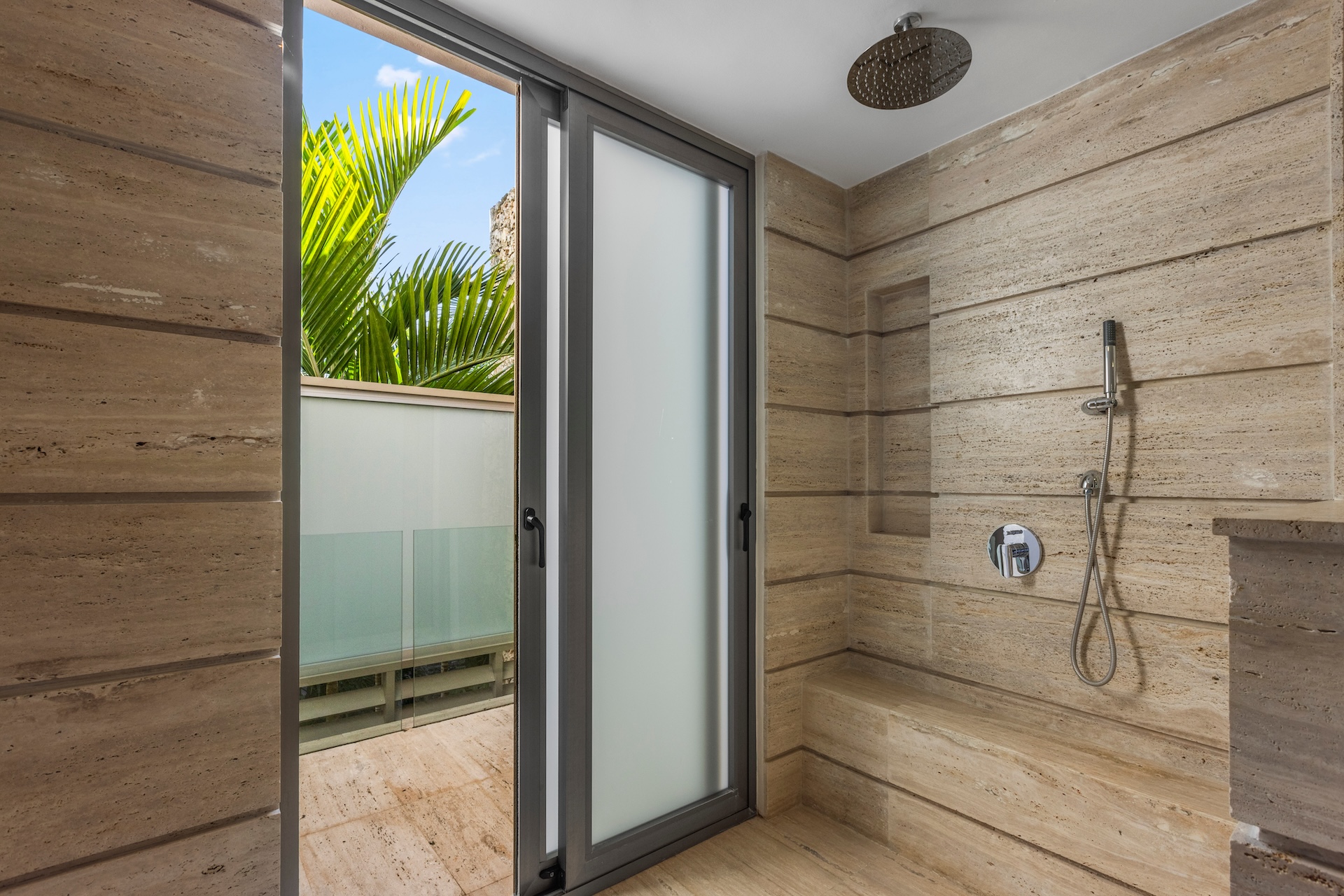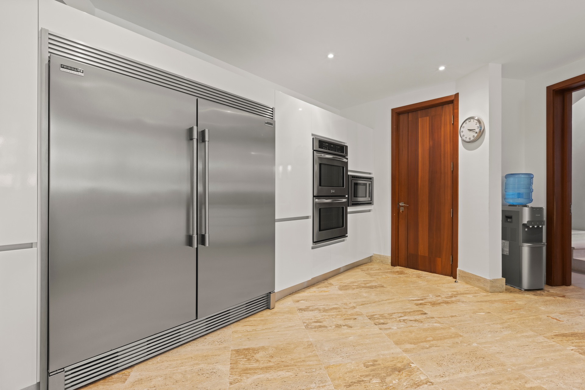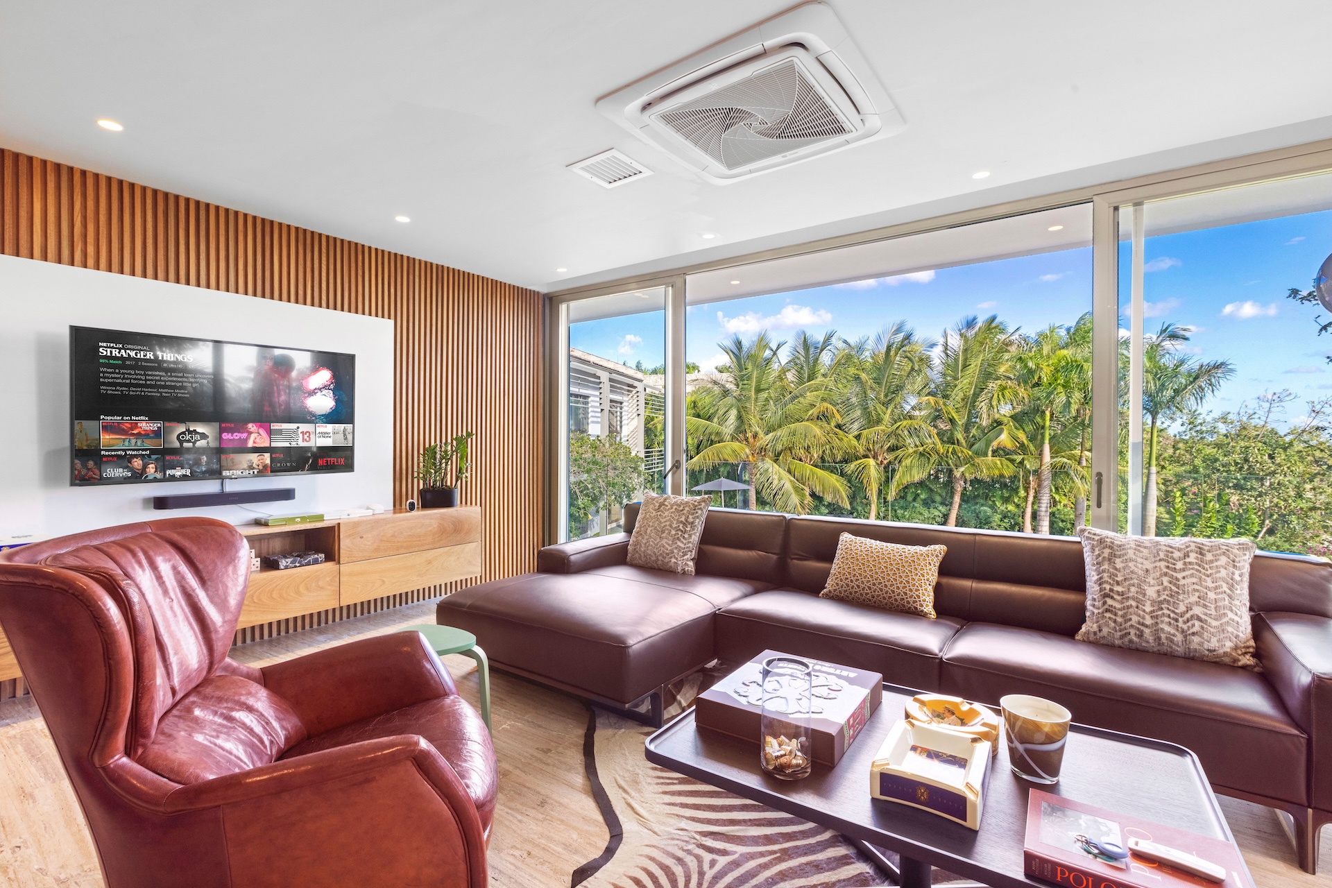 Les espaces intérieurs de Villa Agua ont été conçus pour offrir un équilibre parfait entre sophistication et convivialité. Dès le salon principal, de larges baies vitrées coulissantes ouvrent la pièce vers la terrasse et la piscine. Ainsi, la lumière naturelle circule librement et crée une sensation permanente d’espace et de bien-être.