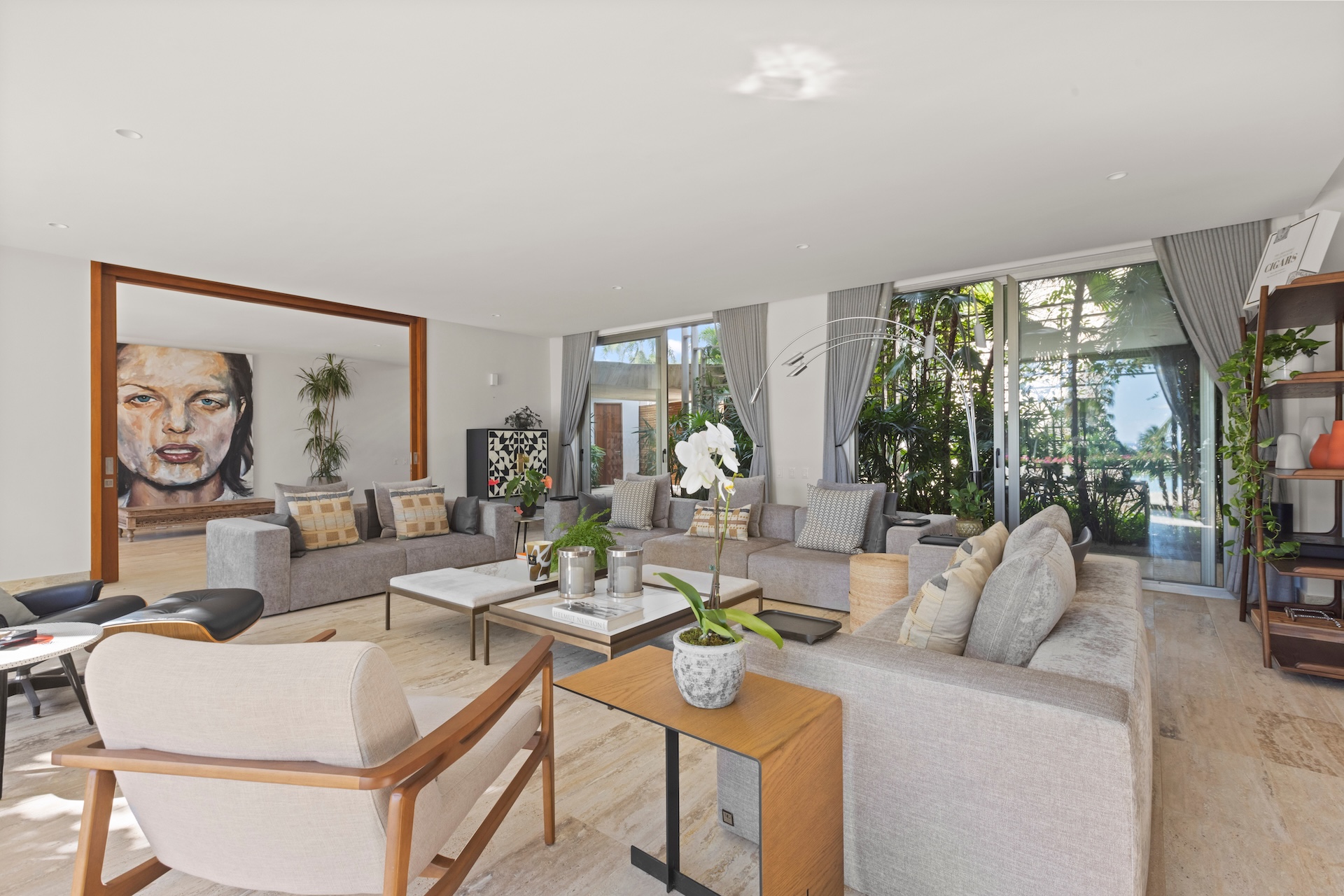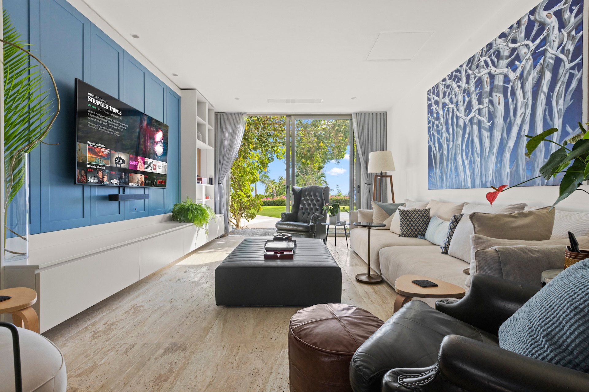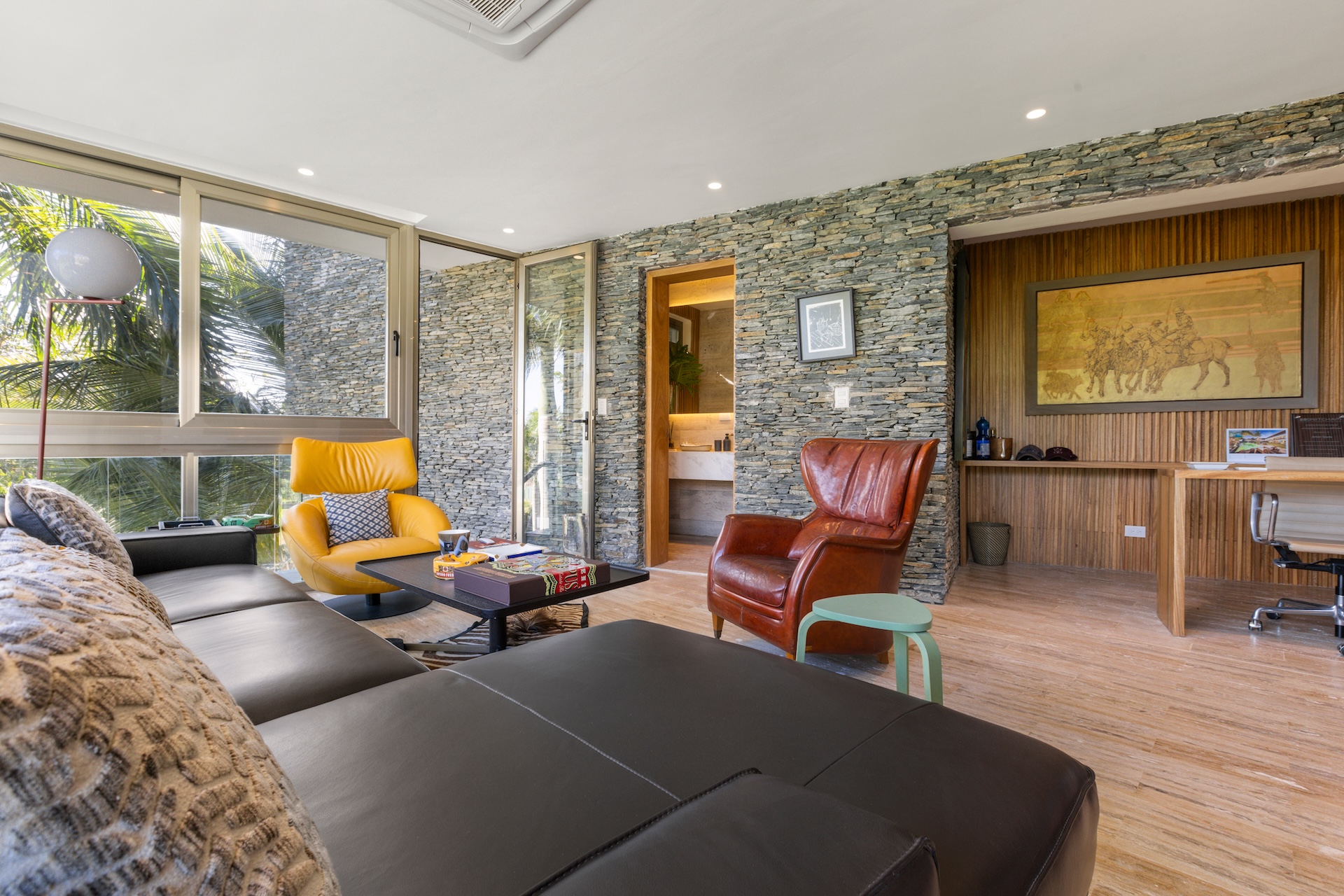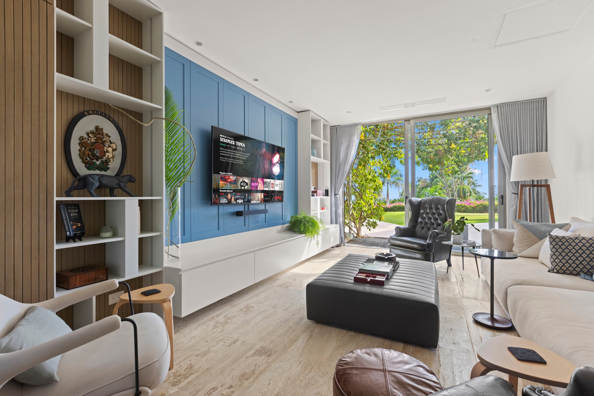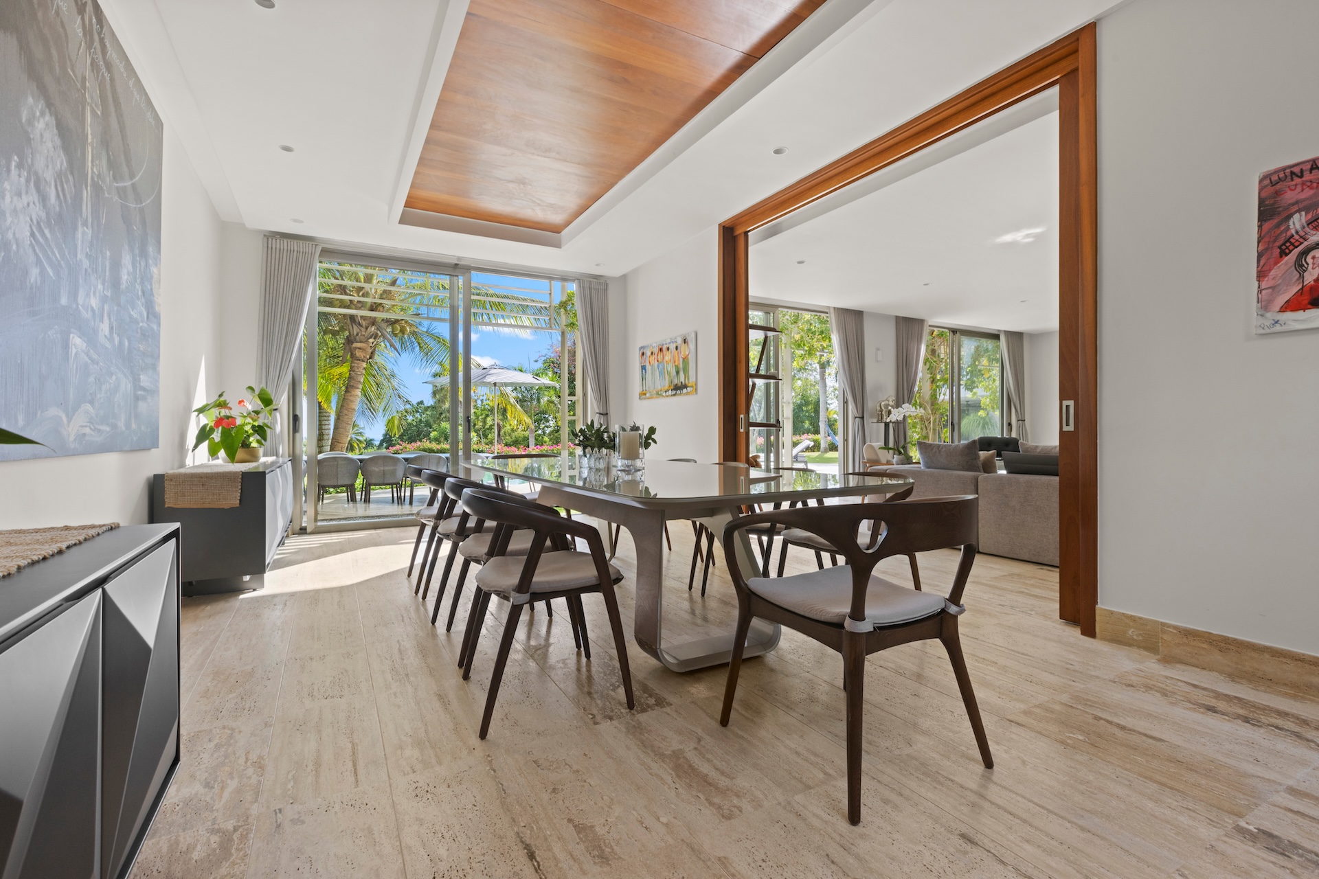 Les matériaux nobles définissent l’identité de la villa. Les sols en pierre naturelle s’associent à des accents de bois et à des teintes neutres, tandis que le mobilier contemporain apporte une touche élégante et intemporelle. De plus, des œuvres d’art soigneusement sélectionnées complètent cette décoration raffinée.