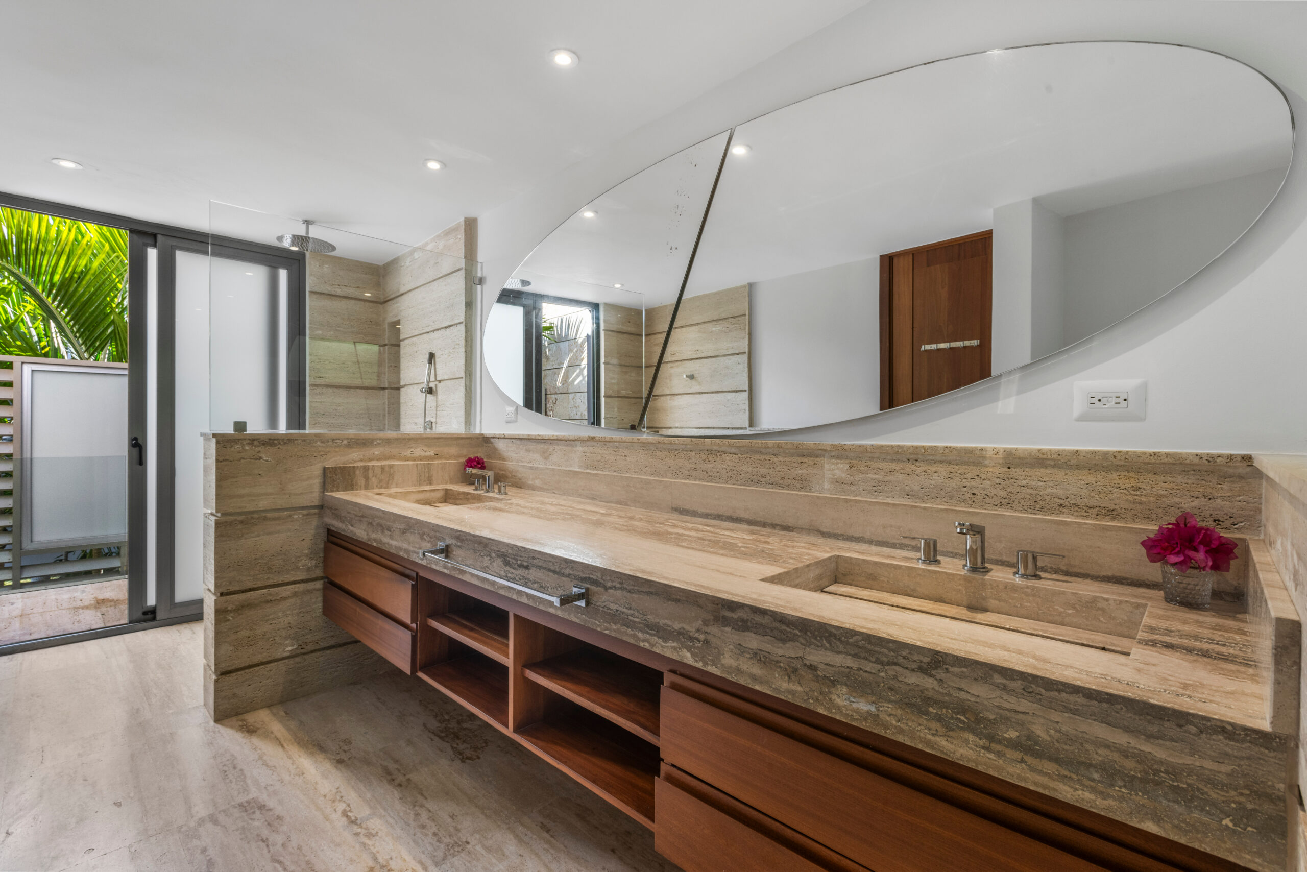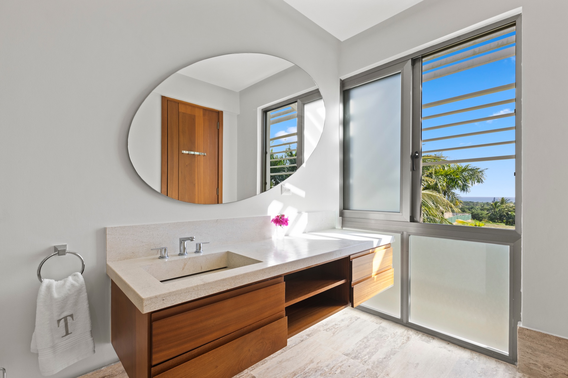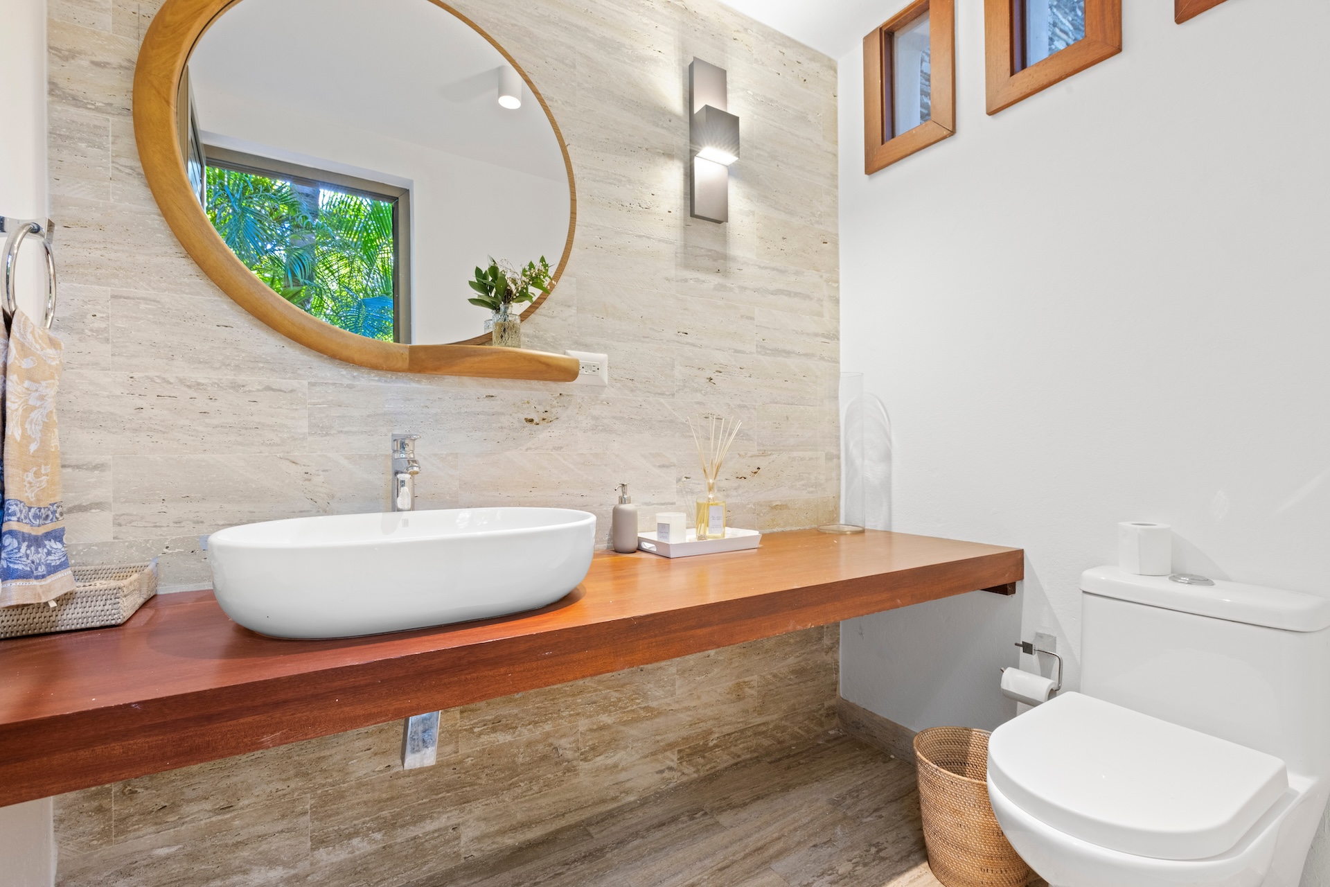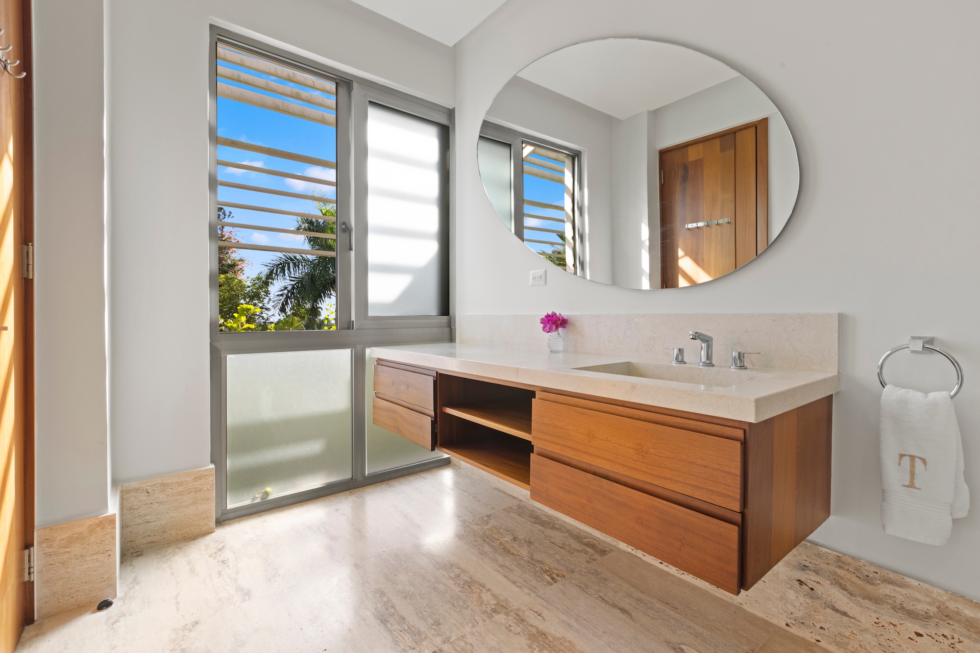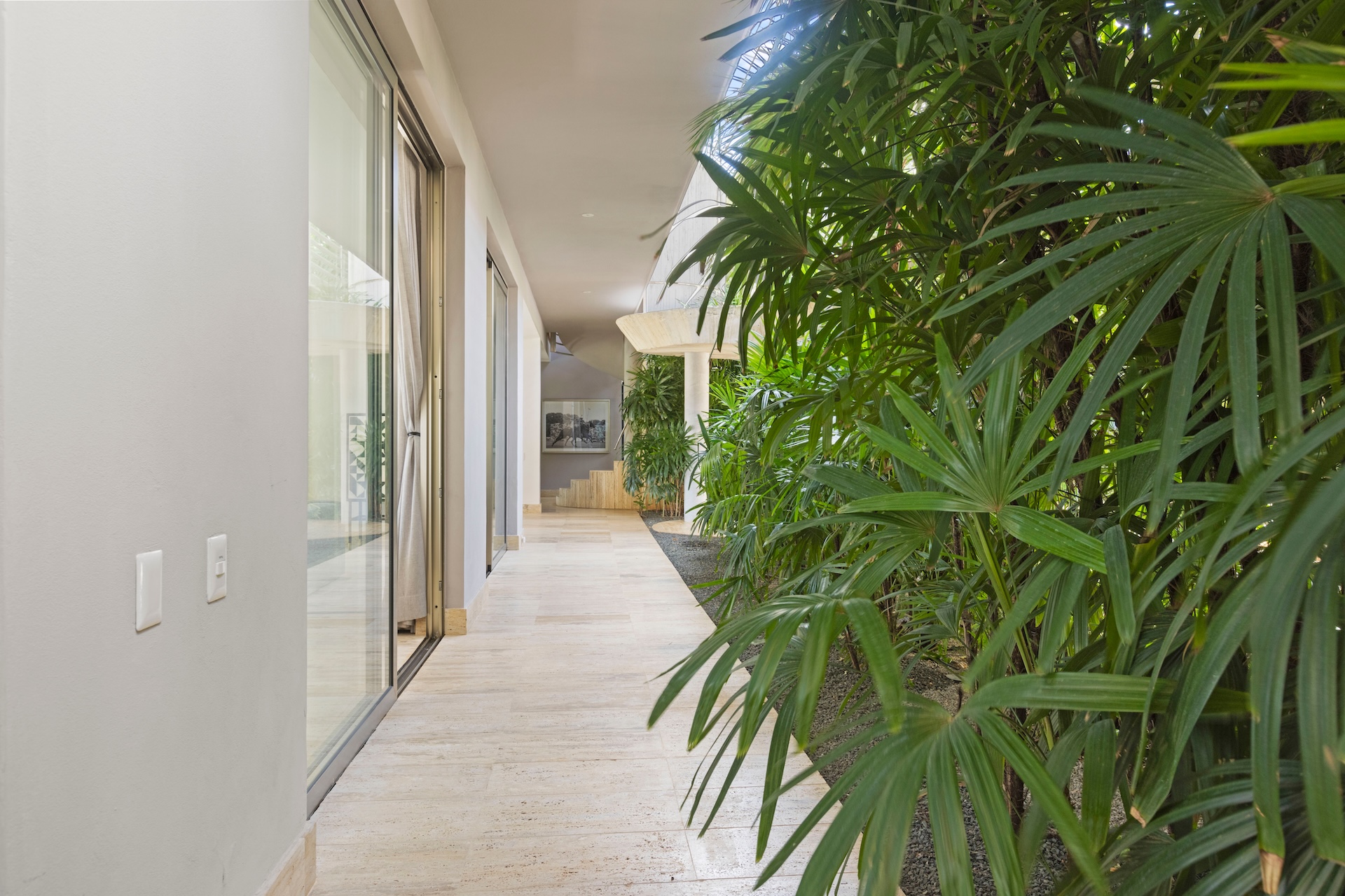 Les matériaux nobles définissent l’identité de la villa. Les sols en pierre naturelle s’associent à des accents de bois et à des teintes neutres, tandis que le mobilier contemporain apporte une touche élégante et intemporelle. De plus, des œuvres d’art soigneusement sélectionnées complètent cette décoration raffinée.