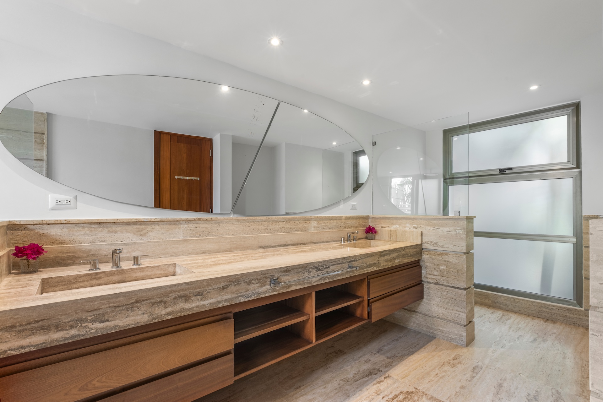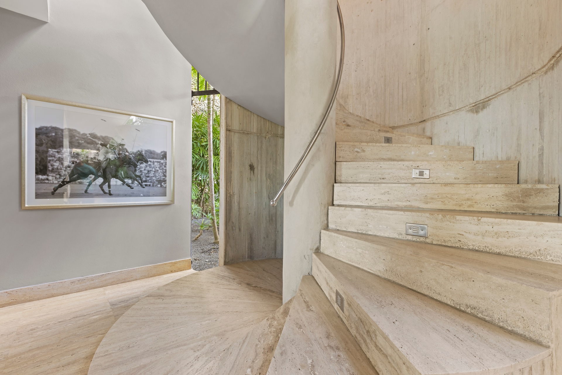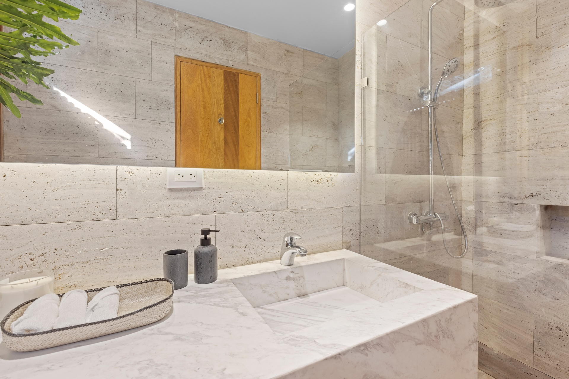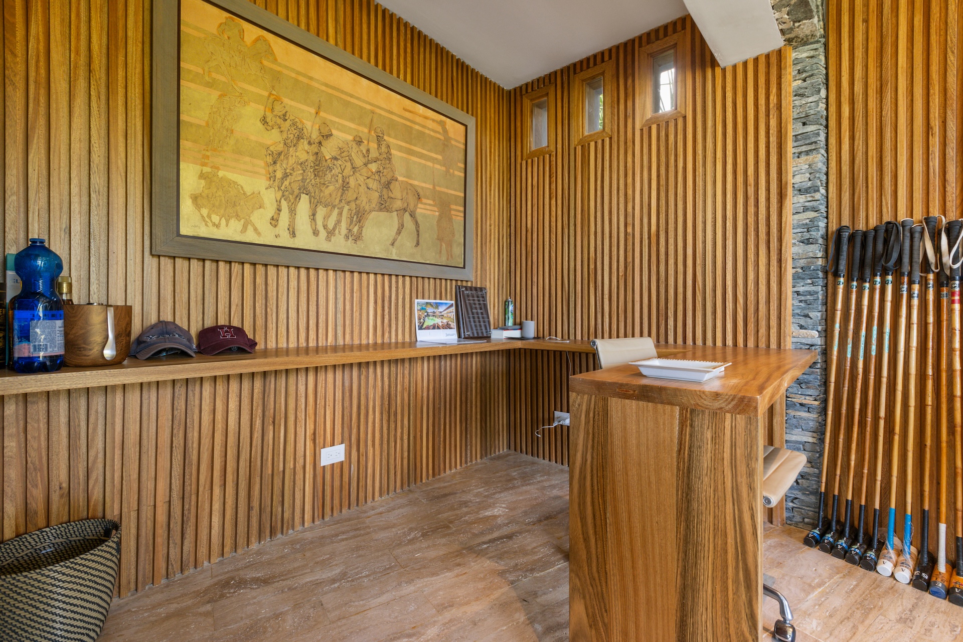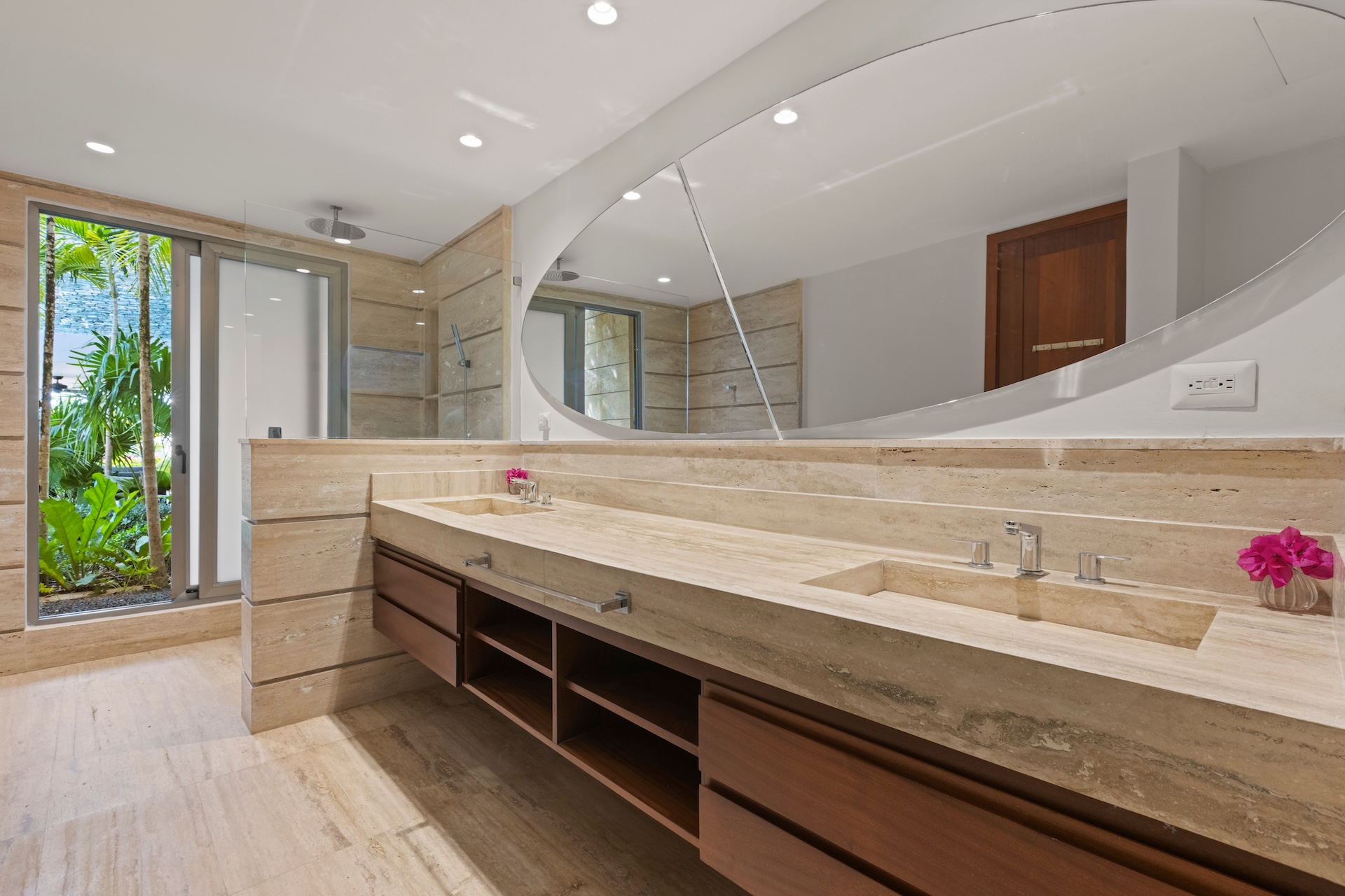Les matériaux nobles définissent l’identité de la villa. Les sols en pierre naturelle s’associent à des accents de bois et à des teintes neutres, tandis que le mobilier contemporain apporte une touche élégante et intemporelle. De plus, des œuvres d’art soigneusement sélectionnées complètent cette décoration raffinée.