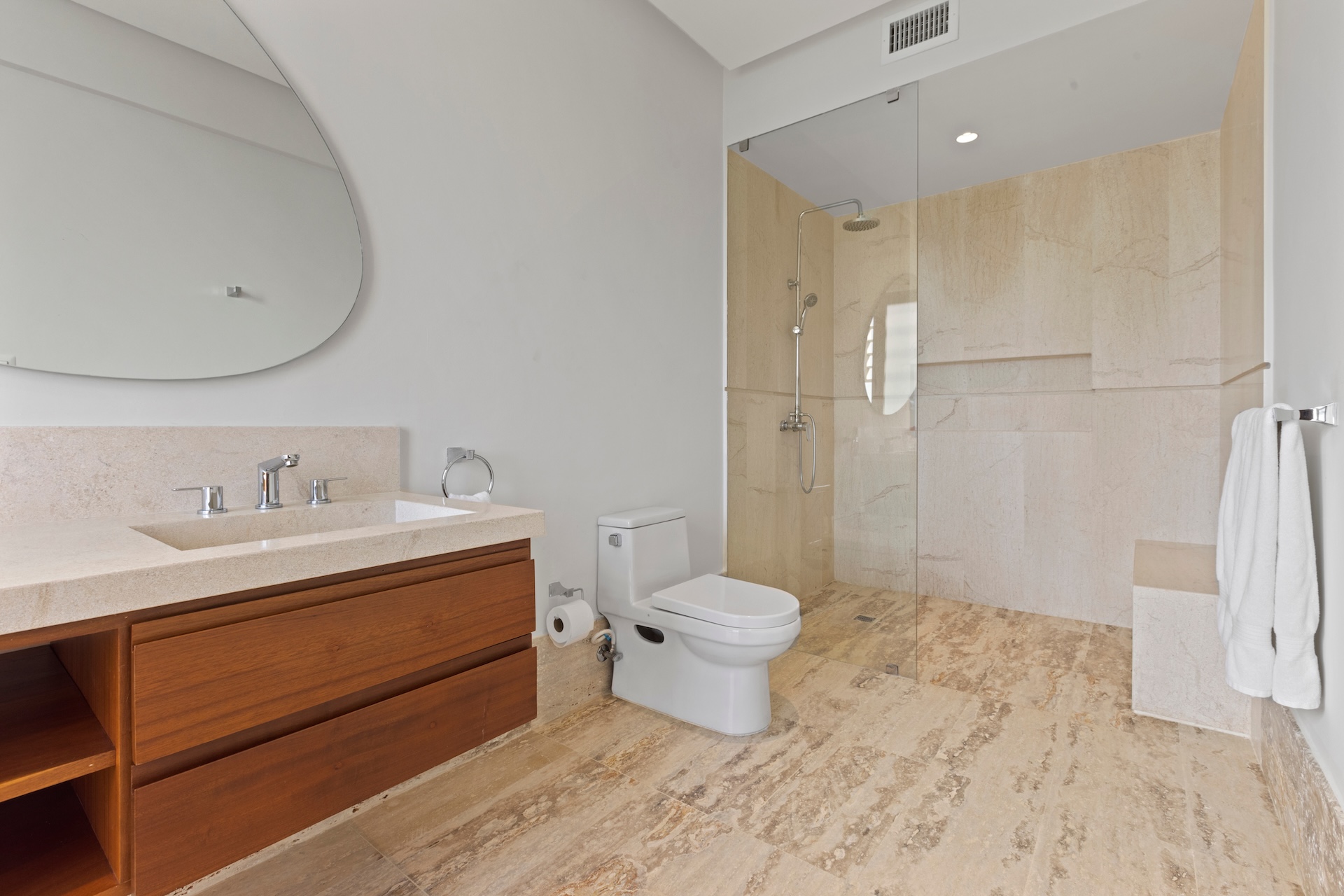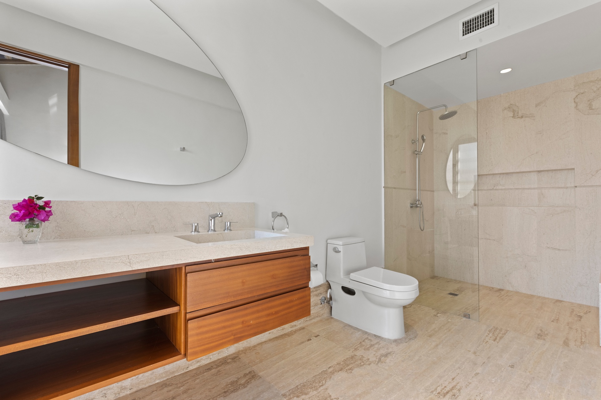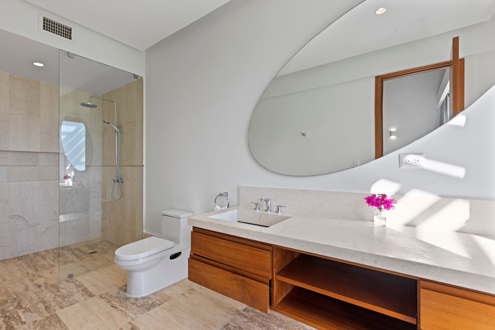Chaque chambre de Villa Agua a été pensée comme une suite indépendante. Les salles de bain disposent notamment de doubles vasques, de douches spacieuses et de finitions haut de gamme. Les vues sur le jardin ou les cimes des arbres renforcent la sensation de calme et de sérénité.